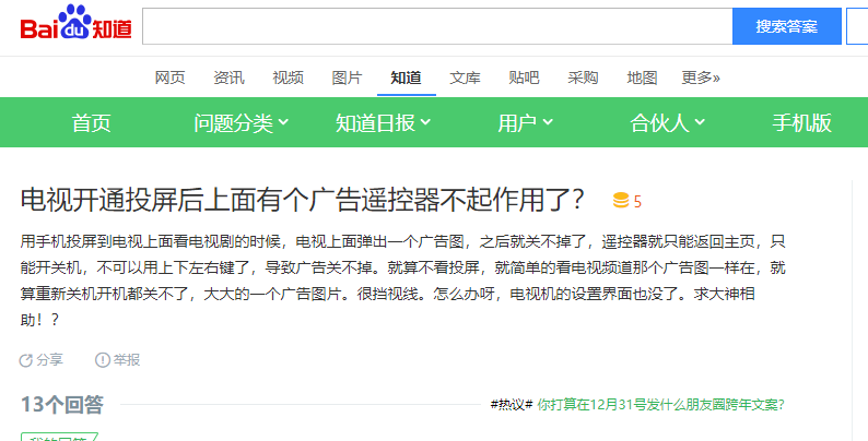 “用手機投屏到電視上面看電視劇的時候,電視上面彈出一個廣告圖,之后就關不掉了,遙控器就只能返回主頁,只能開關機,不可以用上下左右鍵了,導致廣告關不掉。就算不看投屏,就簡單的看電視頻道那個廣告圖一樣在,就算重新關機開機都關不了,大大的一個廣告圖片。很擋視線。怎么辦呀,電視機的設置界面也沒了。電視售后400開頭的電話居然是關機狀態。求大神相助?”
