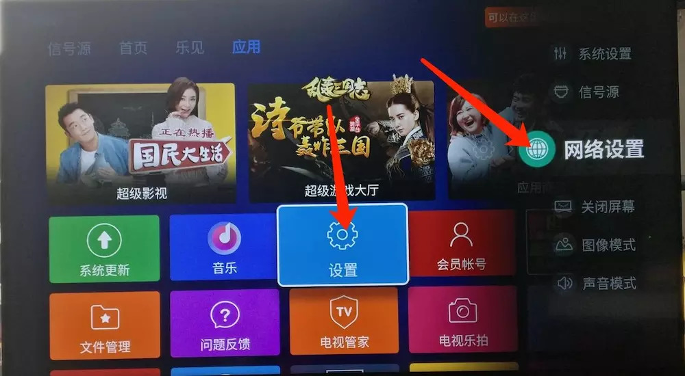 電視端不同的品牌不同的設置方法,本文將小米電視為例,打開小米電視首頁,找到右上角的設置按鈕,點擊進去。在打開的界面中找到“網絡”,點擊進去。